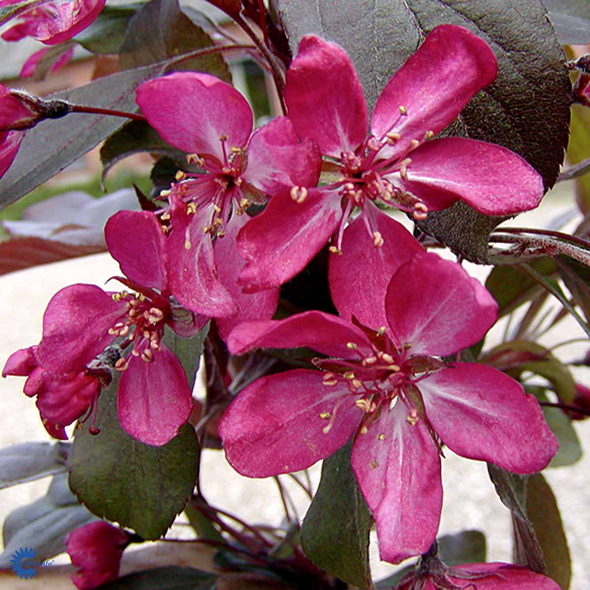 Pardisæble lille kompakt træ podet på stamme 60 cm. rødrosa blomster i maj, rødlig blade, små mørkerøde æbler i efteråret. God til krukker.