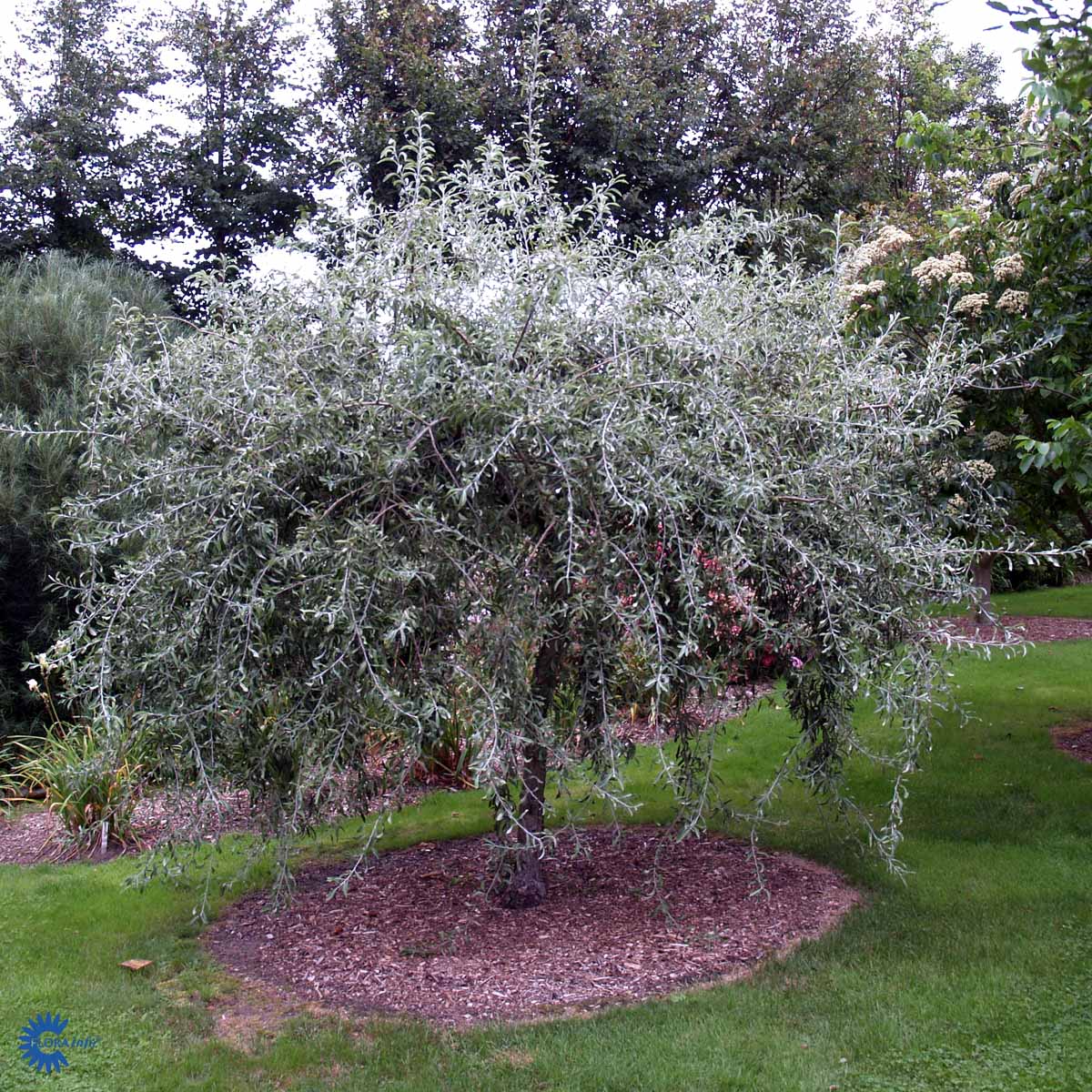 Pilebladet Prydpære (Nordisk Oliven) Lille træ podet på stamme 80 cm. Hængende udbredt vækst, sølvgrå let filtede blade, hvide blomster i april. God til krukker.